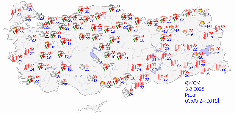 3 Ağustos Pazar: Gökgürültülü Sağanak Yağışlı, 28°C / 16°C