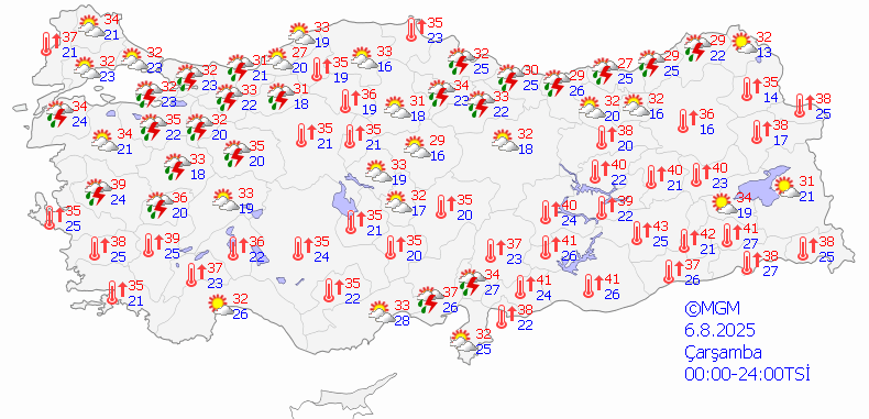 6 Ağustos Çarşamba: Gökgürültülü Sağanak Yağışlı, 29°C / 16°C