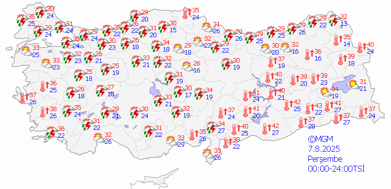7 Ağustos Perşembe: Gökgürültülü Sağanak Yağışlı, 26°C / 16°C