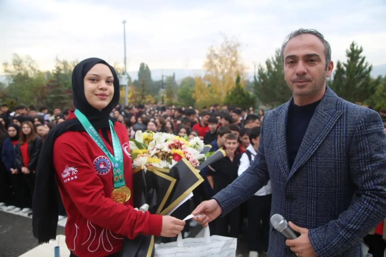 Törende okul müdürü Erdinç Öztürk, Afra Kılınç’a çiçek takdim ederek başarısından duyduğu gururu dile getirdi. Öztürk, “Afra’nın bu başarısı sadece okulumuz için değil, tüm Sivas için büyük bir gurur kaynağıdır. Onun azmi, disiplinli çalışması ve inancı, gençlere örnek olmalı.” ifadelerini kullandı.
