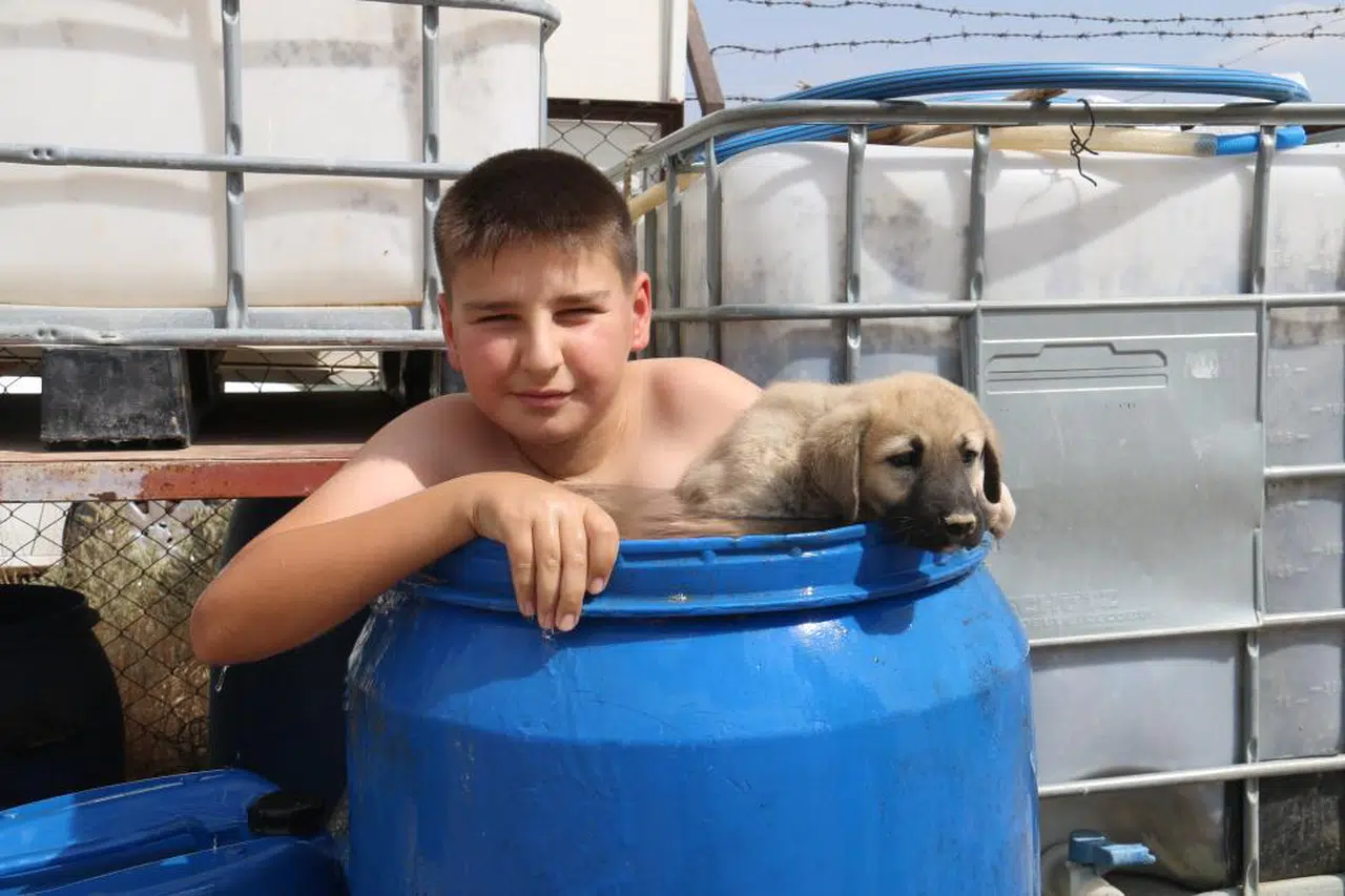 Sivas’ta yaşayan 9 yaşındaki Ali Yıldız ise hem kendi serinlemek hem de yavru kangal dostunu rahatlatmak için etkileyici bir çözüm üretti. Ailesine ait kangal çiftliğinde bulunan su varilini dolduran Ali, önce kendisi içine girerek serinledi, ardından yavru kangalını da yanına alarak onu da sıcaklardan korumaya çalıştı.