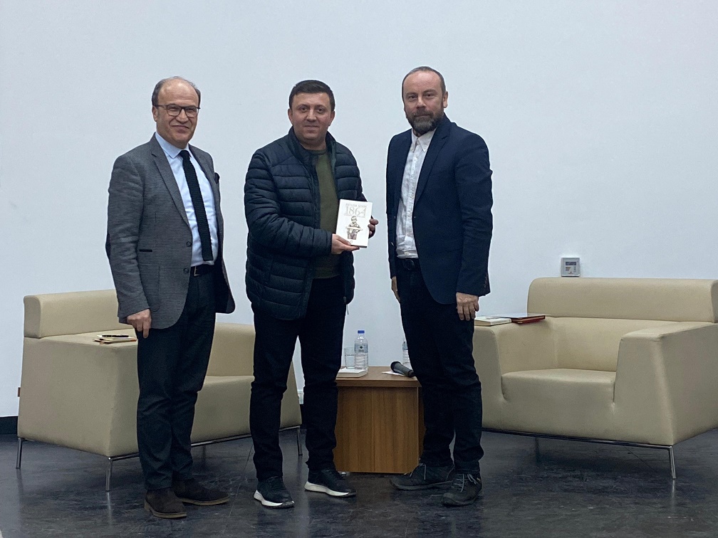 Katılımcıların kitaplarını imzalayan Elbruz Aksoy, Sivas Belediyesi Kültür ve Sosyal İşler Müdürü Alper Karaca'ya imzalı kitap hediye etti.