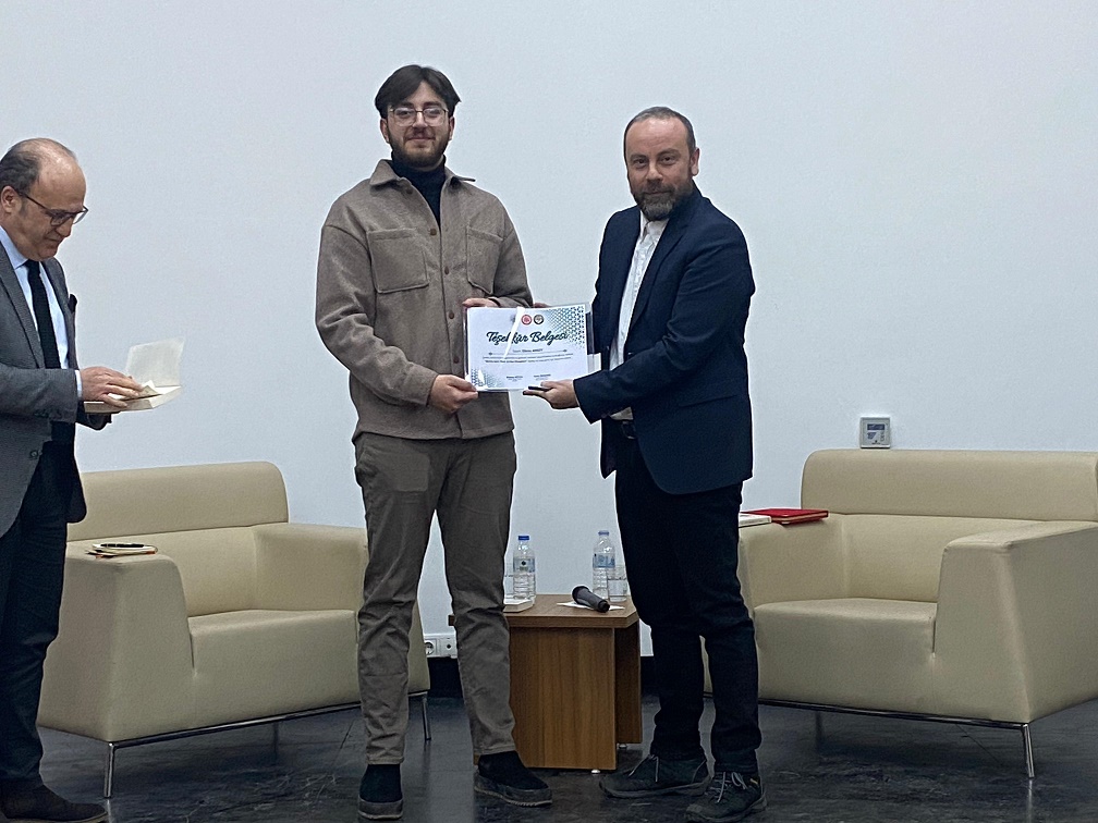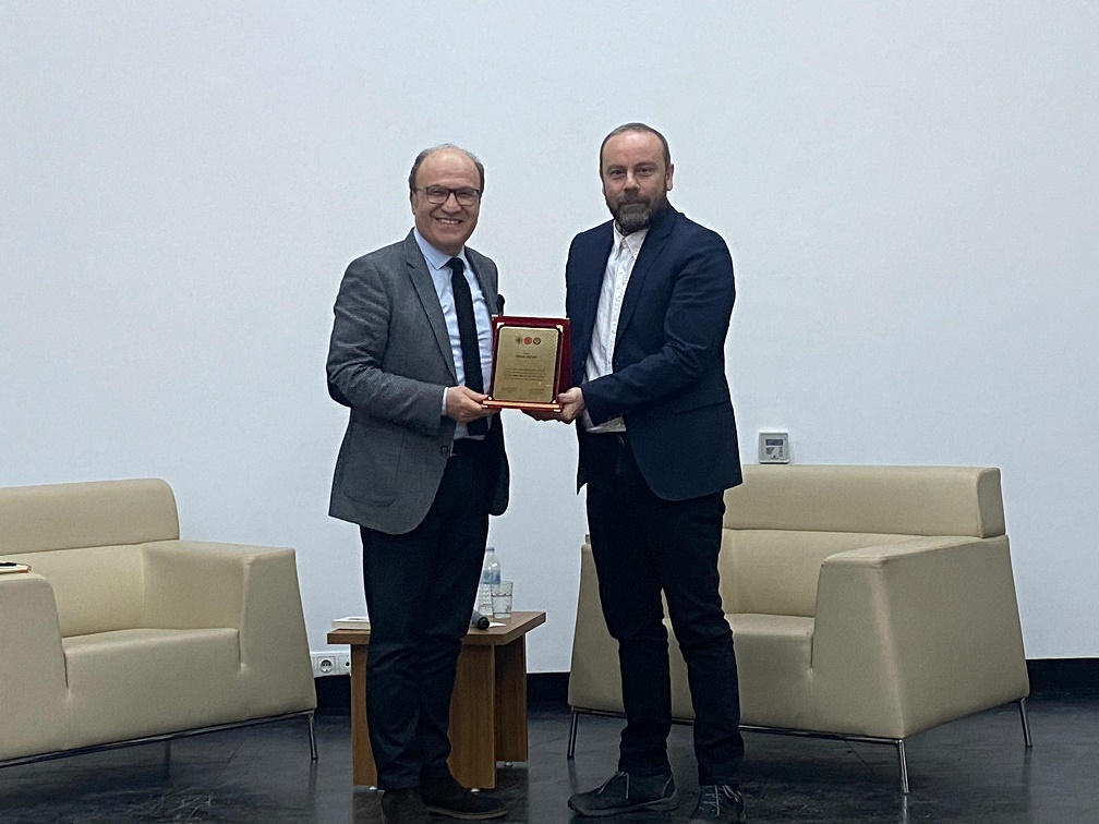 Sivas Kuzey Kafkas kültür Derneği Başkanı Mehmet Fatih Özdemir Elbruz Aksoy'a plaket takdim ederken, Sivas Cumhuriyet Üniversitesi Kafkas Halkları akademik Araştırmaları Topluluğu Başkanı Rıdvan Köten, Aksoy'a katılımlarından dolayı teşekkür belgesi takdim etti.