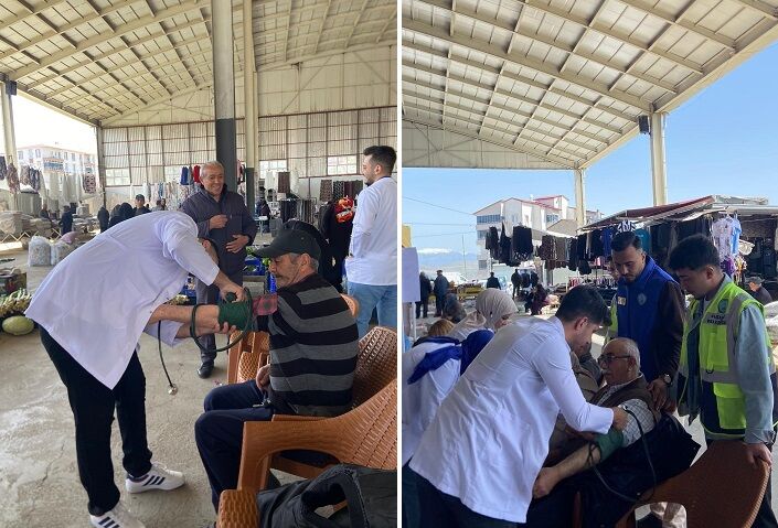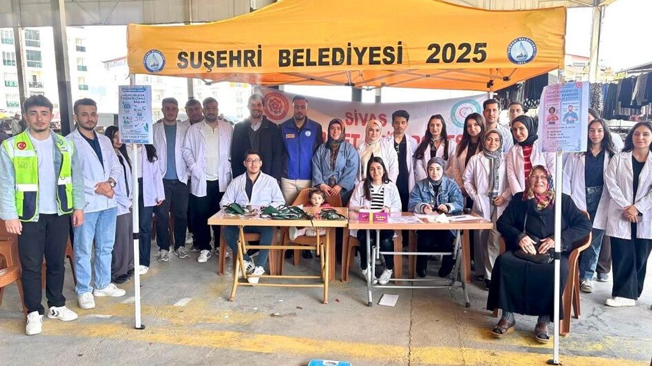 Sivas’ın Suşehri ilçesinde dikkat çeken bir sosyal sorumluluk çalışmasına imza atıldı. Cumhuriyet Üniversitesi Suşehri Sağlık Yüksekokulu öğrencileri ile Belediye Gençlik Kulübü üyeleri, kapalı halk pazarında vatandaşlara yönelik ücretsiz sağlık taraması gerçekleştirdi. Gün boyu süren etkinlikte vatandaşların şeker ve tansiyon ölçümleri yapılırken, boy ve kilo kontrolleri de titizlikle gerçekleştirildi. Pazar alışverişine gelen vatandaşların yoğun ilgi gösterdiği uygulama, kısa sürede kalabalık bir katılıma ulaştı. Kurulan stantlarda görev alan öğrenciler, hem ölçümleri yaptı hem de birebir iletişim kurarak vatandaşların sorularını yanıtladı.