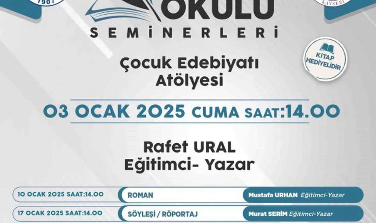 Talas Belediyesi'nin kültür, sanat ve edebiyata gönül verenlerle yazarları buluşturduğu Yazar Okulu Seminerleri programı yeni yılda da sürüyor. Seminerlerin beşincisinde eğitimci Rafet Ural, 3 Ocak Cuma günü gençlerle bir araya gelecek.