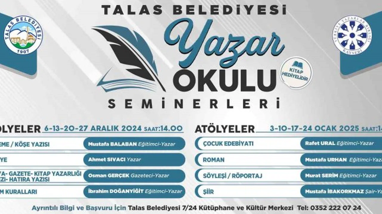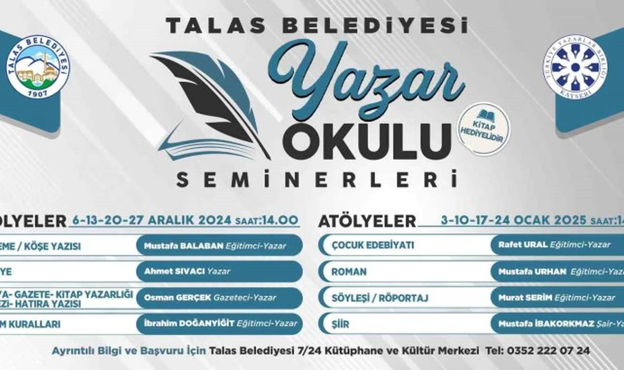 Talas Belediyesi ve Türkiye Yazarlar Birliği Kayseri Şubesi işbirliğiyle gerçekleştirilecek Yazar Okulu Seminerleri programıyla kültür ve edebiyat dünyası ile gençler buluşacak.