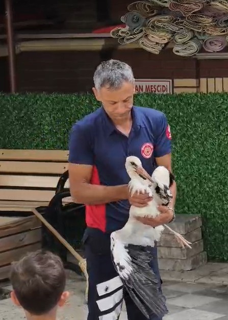 Olay yerine kısa sürede gelen itfaiye ekipleri, leyleği bulunduğu yerden almak için merdivenle müdahale etti. Ancak, alınmak üzereyken dengesini kaybeden leylek verandadan aşağı düştü. Bu sırada görevli bir itfaiyeci, olağanüstü bir refleksle düşen leyleği havada yakalayarak büyük bir tehlikeyi önledi.
