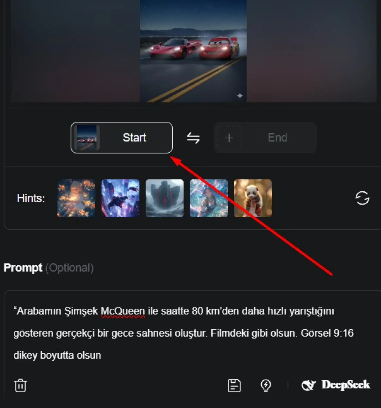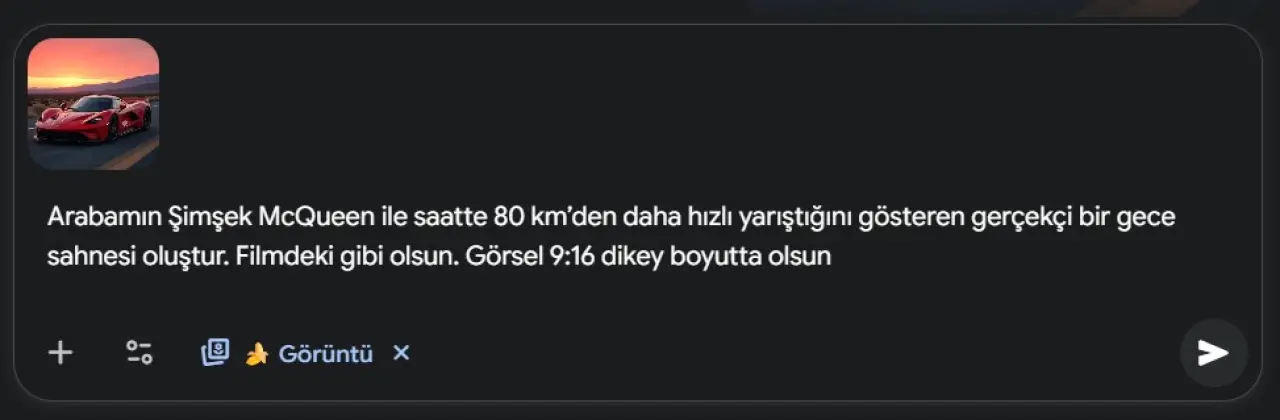 ““Arabamın Şimşek McQueen ile saatte 80 km’den daha hızlı yarıştığını gösteren gerçekçi bir gece sahnesi oluştur. Filmdeki gibi olsun. Görsel 9:16 dikey boyutta olsun”