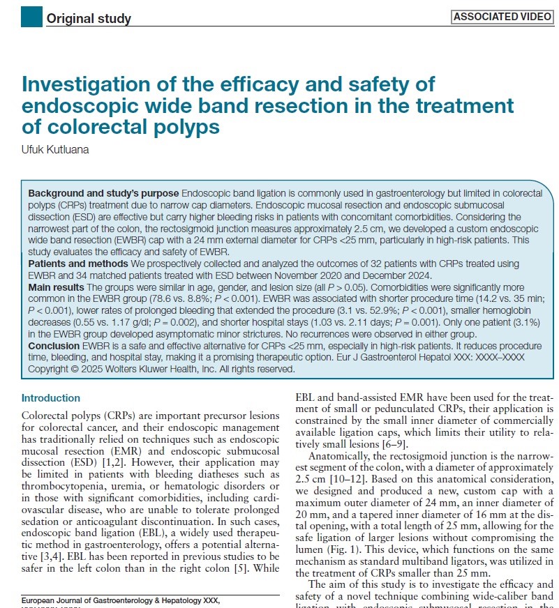 Doç. Dr. Ufuk Kutluana'nın, yeni yöntemiyle tedavi ettiği hastaların sonuçlarını içeren bilimsel makalesi, gastroenteroloji alanının en prestijli yayınlarından biri olan "European Journal of Gastroenterology & Hepatology" dergisi tarafından kısa sürede kabul edilerek orijinal bir eser olarak yayımlandı.