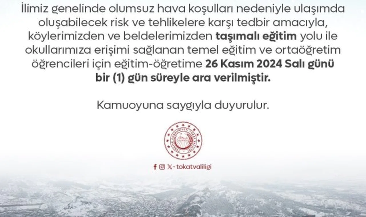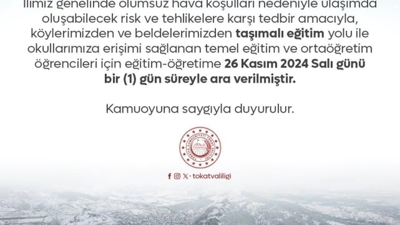 Tokat Valiliğinden yapılan açıklamada, 'İlimiz genelinde olumsuz hava şartları nedeniyle ulaşımda oluşabilecek risk ve tehlikelere karşı tedbir amacıyla, köylerimizden ve beldelerimizden taşımalı eğitim yolu ile okullarımıza erişimi sağlanan temel eğitim ve ortaöğretim öğrencileri için eğitim-öğretime 26 Kasım 2024 Salı günü, 1 gün süreyle ara verilmiştir' denildi.