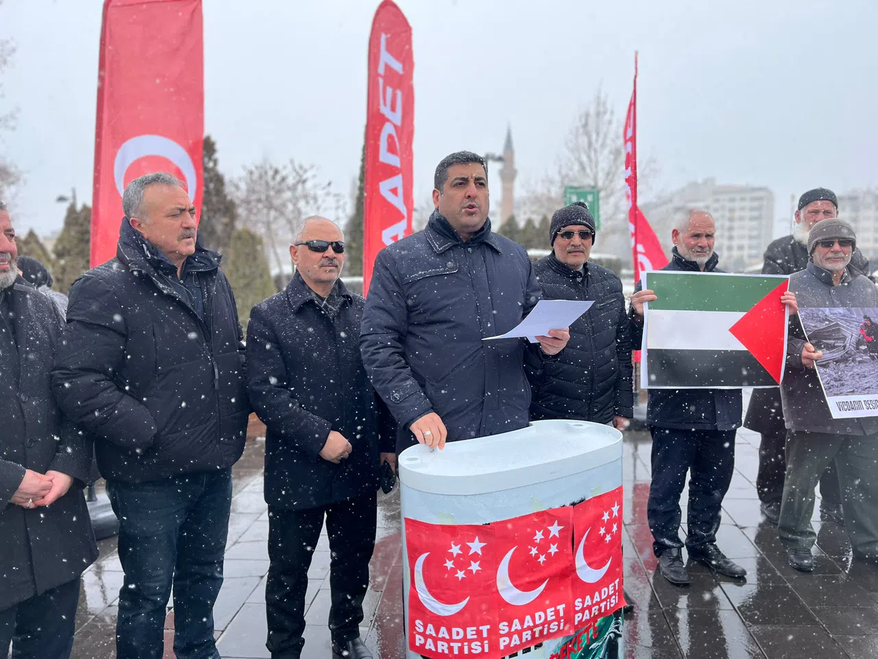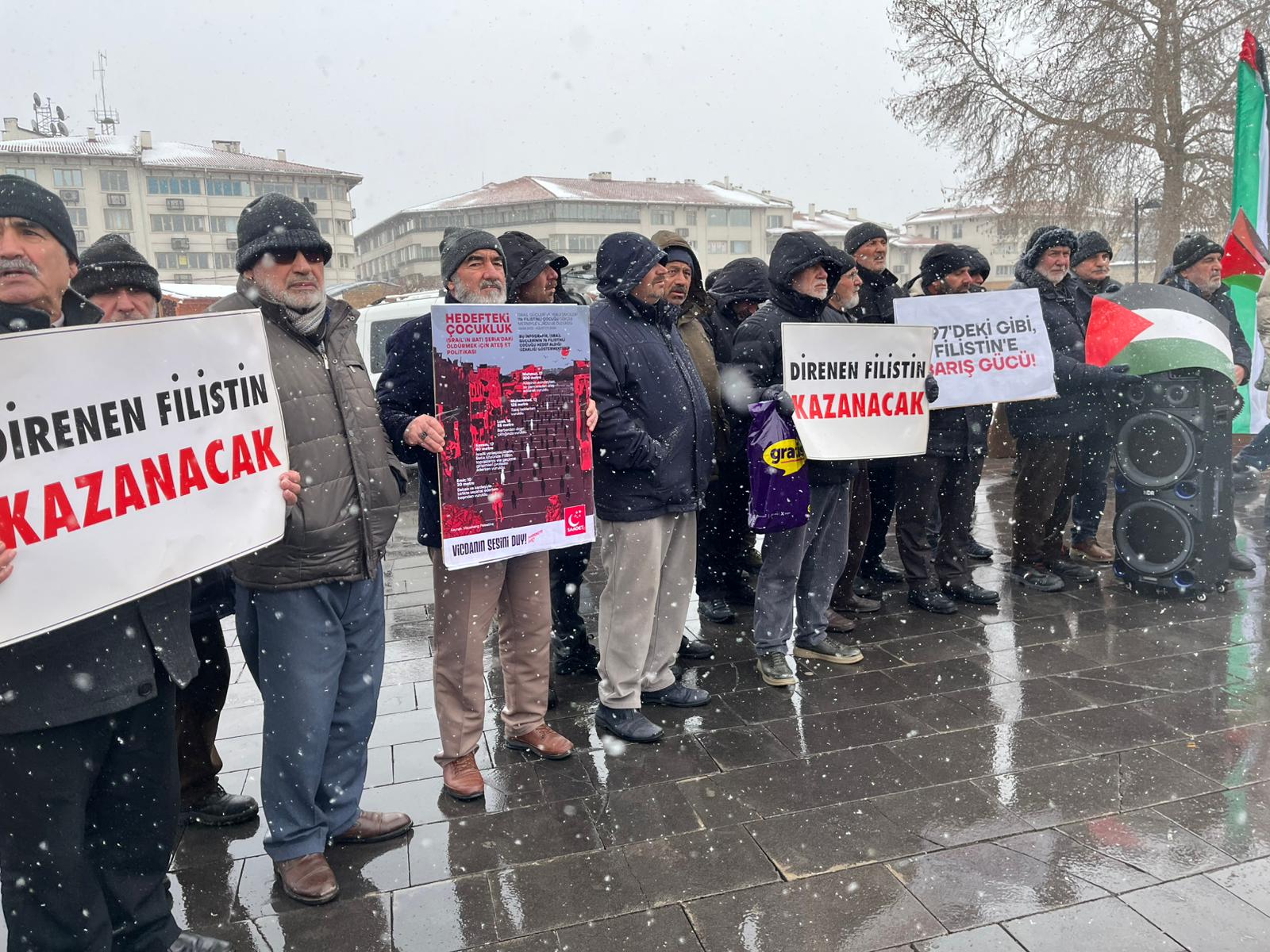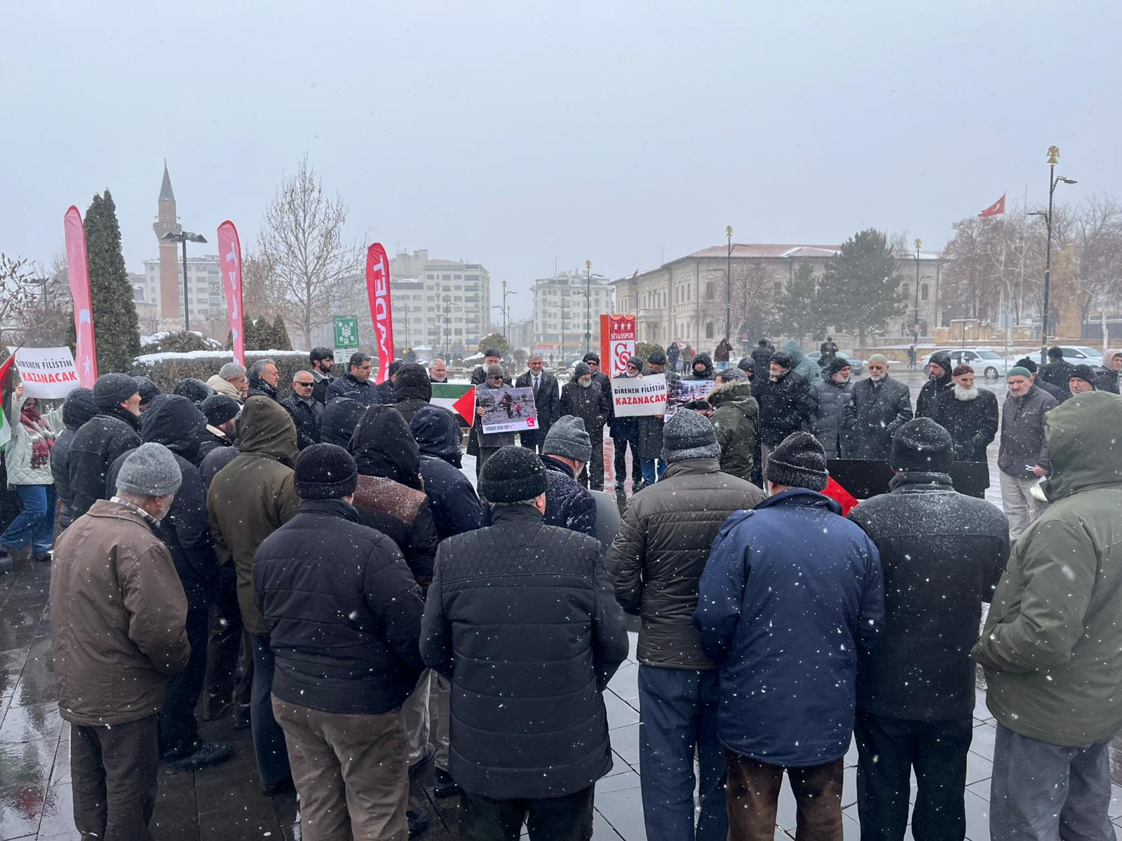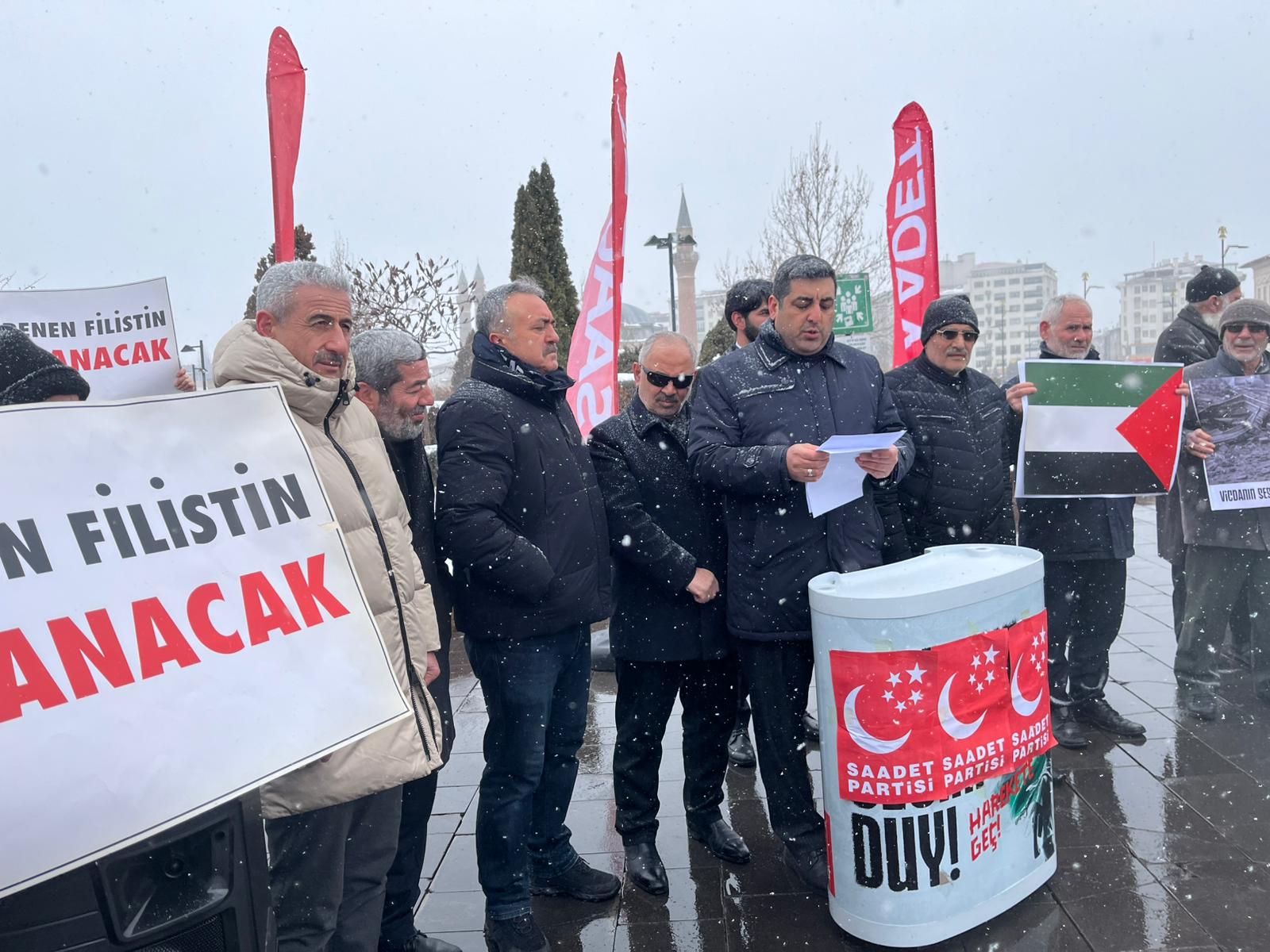 Soğuk havaya rağmen Sivaslı Saadet Partililer Cuma Namazı çıkışı Sivas Hükümet Meydanı Tek Ağaç önünde toplanarak ABD'nin Gazze politikasını eleştirdiler. İl Başkanı Mehmet Tokgöz de burada basın açıklaması yaptı.
