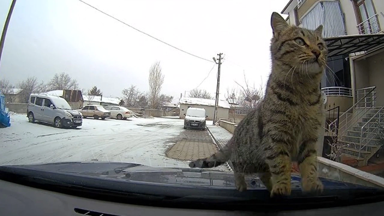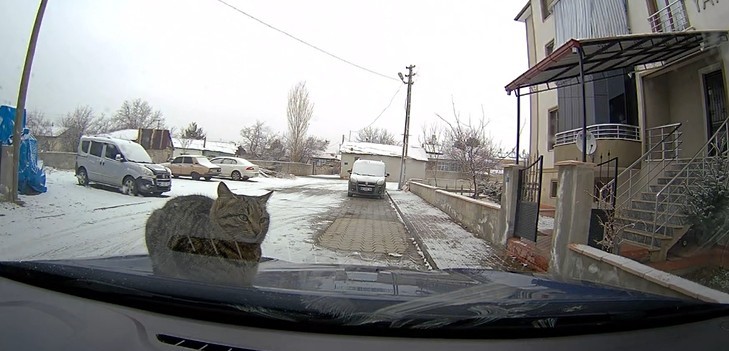 Erzincan'da bir otomobilin üzerine çıkan kedi, araç içi kamerasına yansıdı. Saniye saniye kaydedilen görüntülerde, soğuktan üşüyen kedinin aracın motor kısmından gelen sıcaklıkla ısındığı görüldü.