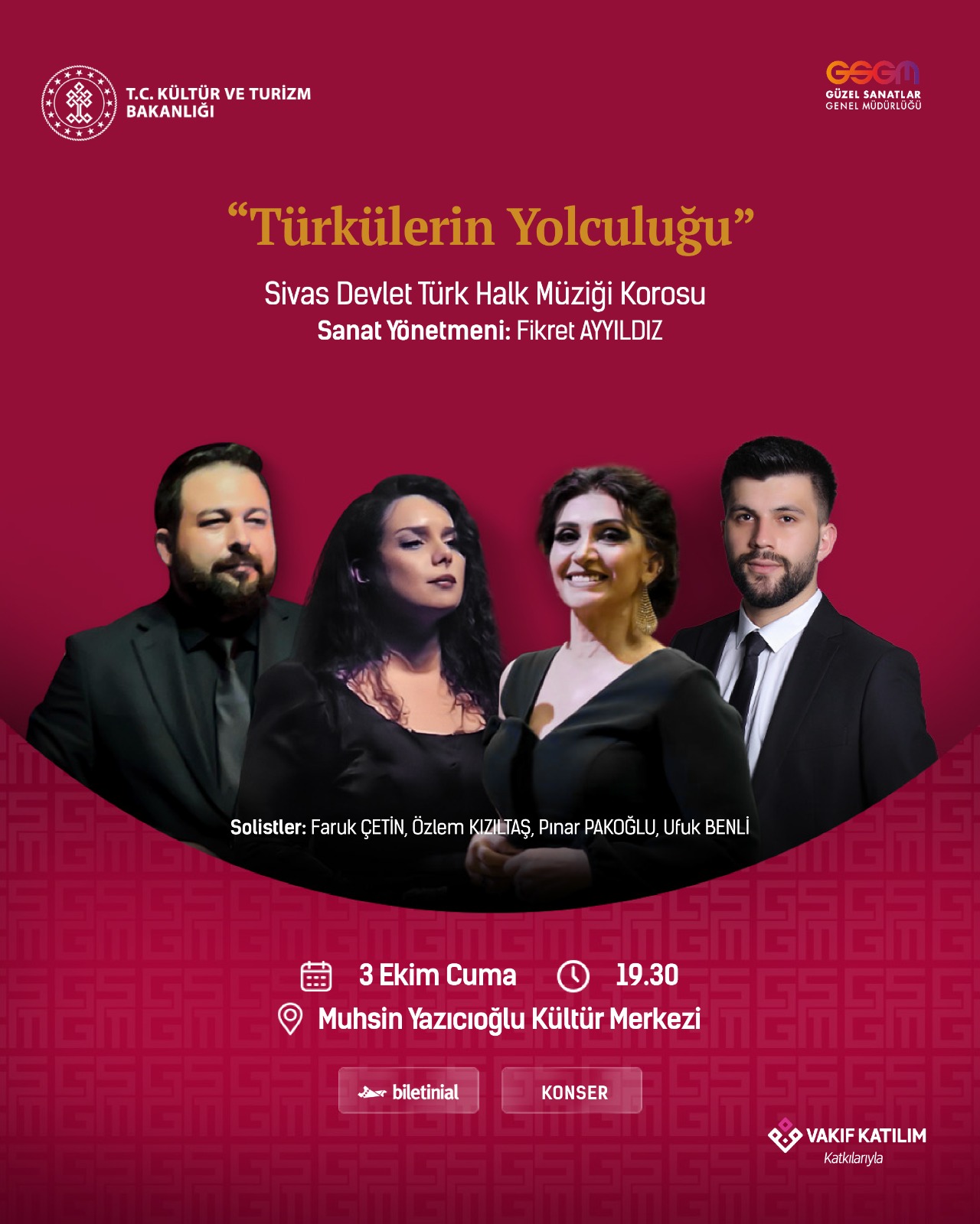 Sivas, sonbahar akşamlarını sanatla ısıtmaya hazırlanıyor. T.C. Kültür ve Turizm Bakanlığı Güzel Sanatlar Genel Müdürlüğü bünyesindeki Sivas Devlet Türk Halk Müziği Korosu, "Türkülerin Yolculuğu" adını taşıyan özel bir konserle Sivaslı sanatseverlerin karşısına çıkacak.