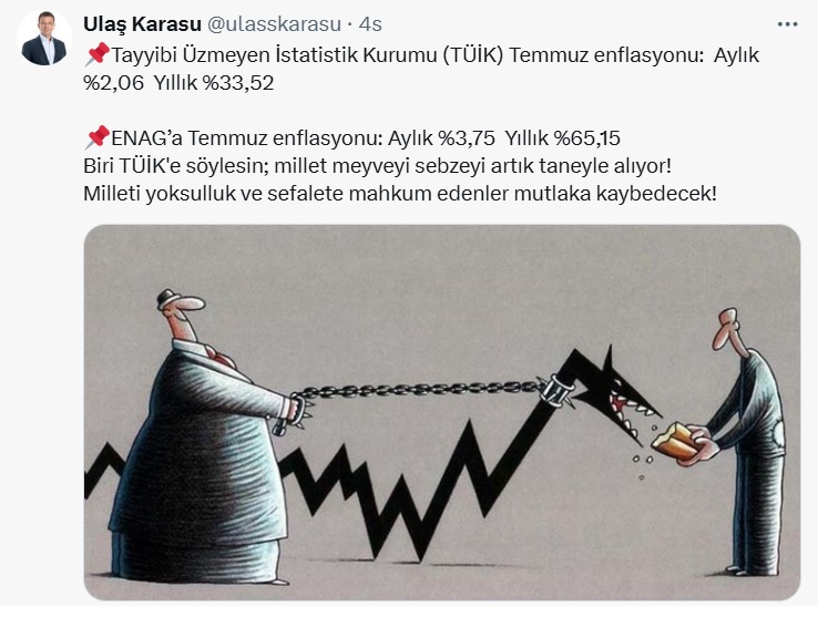 Karasu, Türkiye İstatistik Kurumu’nu (TÜİK) “Tayyibi üzmeyen İstatistik Kurumu” şeklinde nitelendirerek eleştiride bulundu. Paylaşımında, TÜİK’in Temmuz ayı enflasyon oranını aylık yüzde 2,06, yıllık yüzde 33,52 olarak açıkladığını belirten Karasu, Enflasyon Araştırma Grubu’nun (ENAG) verilerine göre ise aynı dönemde enflasyonun aylık yüzde 3,75, yıllık yüzde 65,15 olarak gerçekleştiğini aktardı.