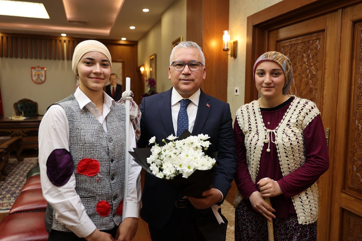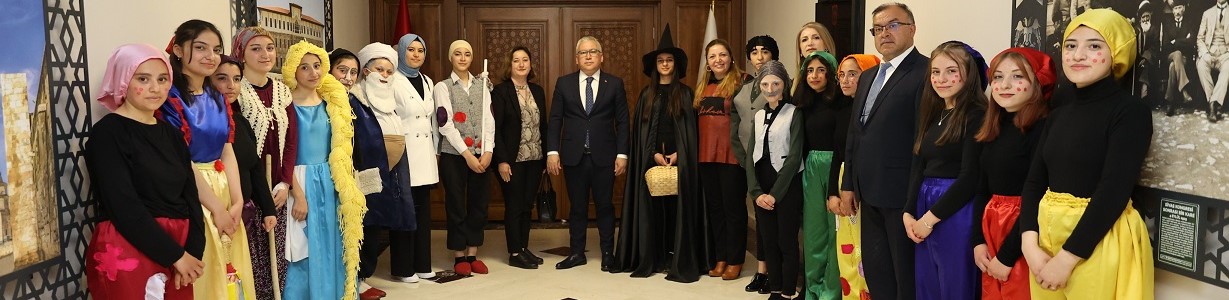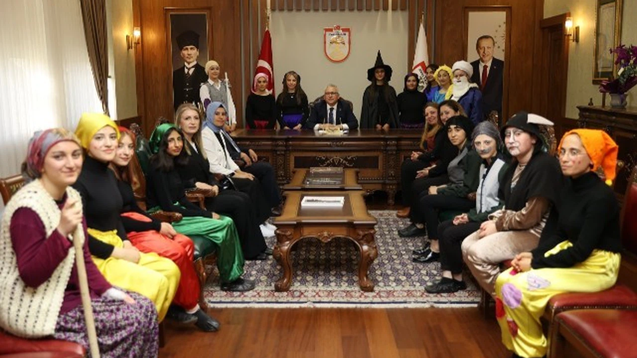 Karşıyaka Mesleki Teknik Kız Anadolu Lisesi 10. sınıf öğrencileri tarafından yazılan, oynanan, kostüm ve dekorasyonları yine öğrenciler tarafından hazırlanan “Keloğlan Masallarda” tiyatrosu ekibi, Sivas Valisi Yılmaz Şimşek'i makamında ziyaret etti.