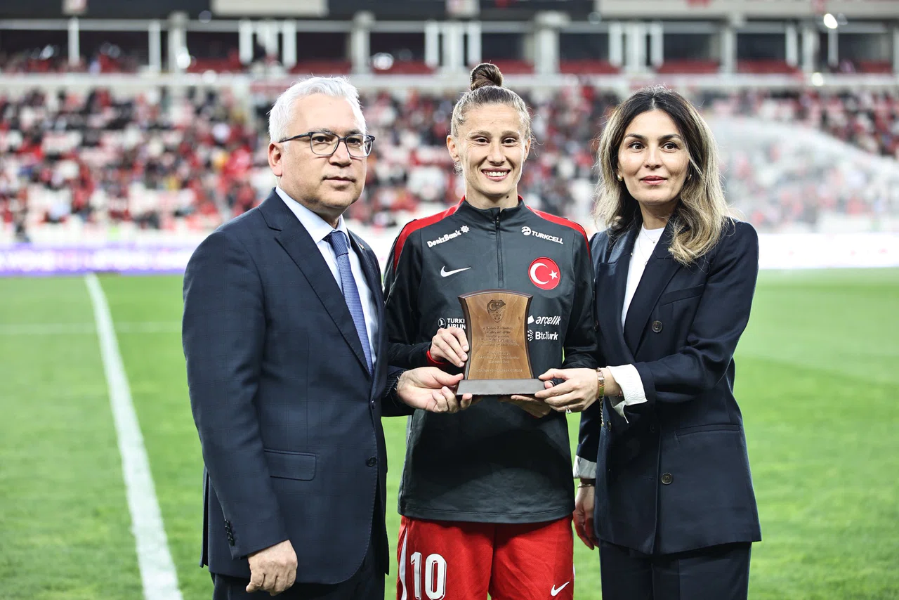 Maç öncesinde, millî formayı 100. kez giyme başarısı gösteren oyuncular için özel bir plaket töreni düzenlendi. Millî takımın tecrübeli isimlerinden Ebru Topçu’ya plaketini Vali Yılmaz Şimşek takdim etti.