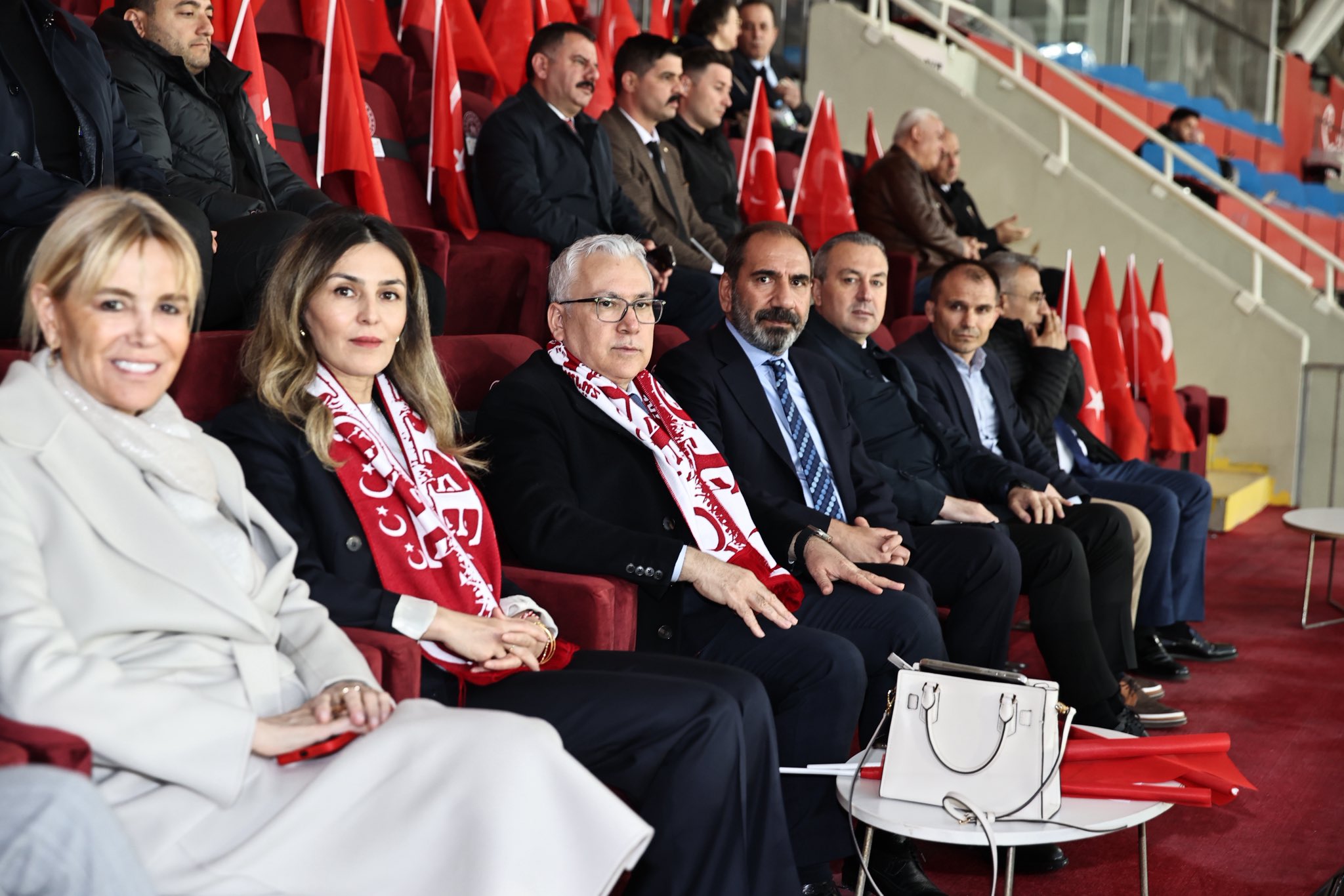 Mücadeleyi tribünden takip eden Sivas Valisi Yılmaz Şimşek, eşi Dr. Çiğdem Olgun Şimşek ve Sivas Belediye Başkanı Adem Uzun, ay-yıldızlı ekibe destek verdi.