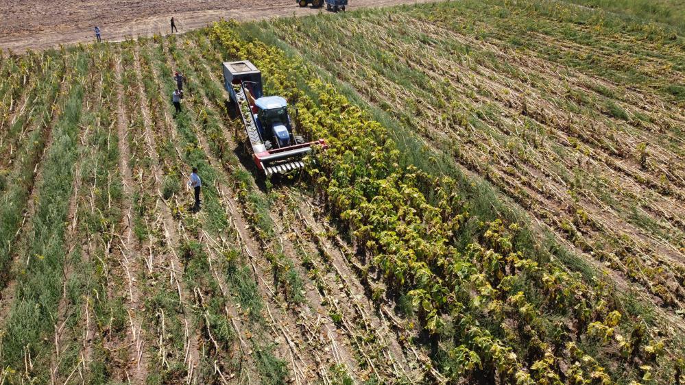 Yozgat’ın Yerköy ilçesine bağlı Sekili bölgesinde üreticiler, binbir emekle yetiştirdikleri ay çekirdeklerini patozdan geçirerek kurutmaya bırakıyor. Bölgede ay çekirdeği üretimi önemli bir merkez olmasına rağmen, bu yıl bazı verim sorunları yaşanıyor. Çiftçi Murat Kaya, "Daha önce kesip yere atarak 3 gün kurutuyorduk. Yeni makineyle 20 kişinin yaptığı işi tek başına yapıyor. İşlerimiz artık makineyle rahatladı. 50 dönümlük tarla 3-4 gün sürerken, şimdi 1-1,5 gün içinde hasat ediliyor" ifadelerini kullandı.
