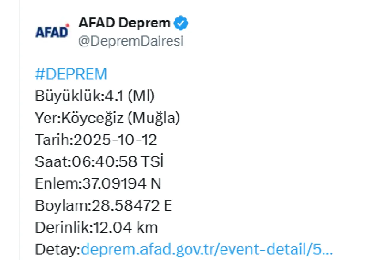 Muğla’nın Köyceğiz ilçesinde sabah saatlerinde korkutan bir deprem meydana geldi. Afet ve Acil Durum Yönetimi Başkanlığı (AFAD) tarafından yapılan açıklamaya göre, deprem 4.1 büyüklüğünde kaydedildi.