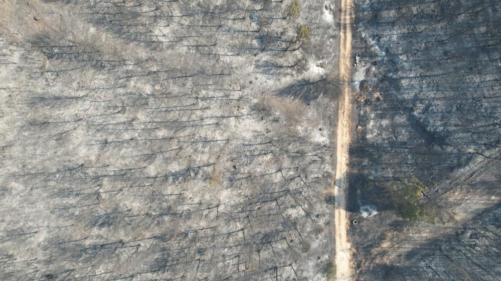 Havadan çekilen görüntüler ise felaketin boyutunu gözler önüne serdi. Bir zamanlar yemyeşil olan ormanlık alanların siyaha ve griye döndüğü, dumanların gökyüzünü kapladığı görülüyor.