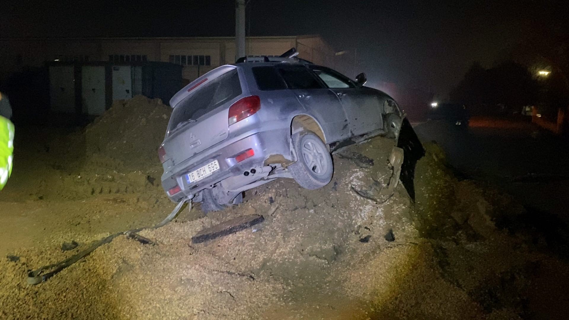 Kaza saat 00.00 sıralarında Cumhuriyet mahallesi Mareşal Fevzi Çakmak Caddesi üzerinde meydana geldi. Cadde üzerinde seyir halinde olan İsmail U. yönetimindeki 16 BCH 696 plakalı cip, sürücünün geç fark etmesi sonucu alt yapı için kazılan toprağa çarparak saplandı.Kaza yerine polis ekipleri sevk edildi.