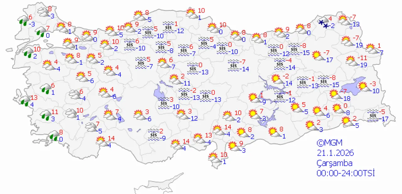 Sivas’ın komşu illerinde de durum farksız değil. Kayseri’de termometreler eksi 13 derecelere kadar gerilerken, Yozgat eksi 10 derece ile bu soğuk hava dalgasından nasibini alacak. Bölge genelini etkisi altına alan bu dondurucu hava ve yoğun sis, 21 Ocak Çarşamba gününü 2026 kışının en zorlu günlerinden biri yapmaya aday görünüyor.