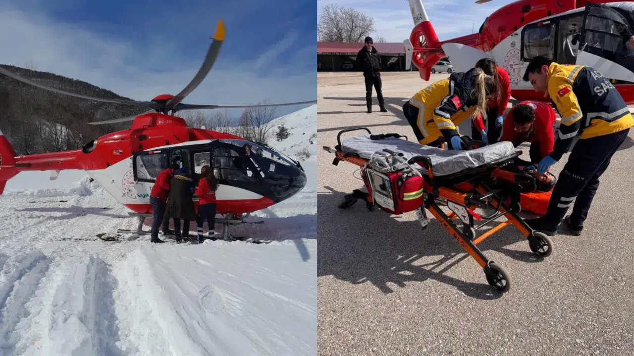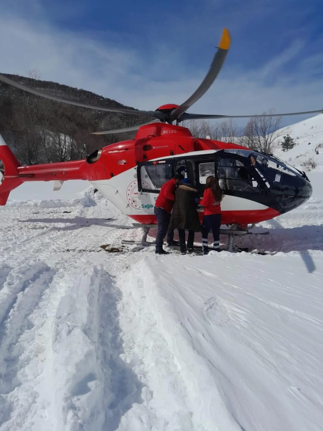 Pervane sesleri köyde yankılanırken, köylüler helikopterin iniş yapabileceği en uygun alanı belirlemek için seferber oldu. Karla kaplı düz bir araziye ustalıkla iniş yapan helikopter ambulans ekibi, dondurucu soğuğa rağmen vakit kaybetmeden hastaya ulaştı. Karların ortasında gerçekleştirilen ilk müdahale, G.K.’nın nefes almasını bir nebze olsun kolaylaştırdı. Sedye ile helikoptere taşınan yaşlı kadın, güvenli bir şekilde gökyüzüne havalanırken köy halkı bu anları hem merak hem de dualarla takip etti.