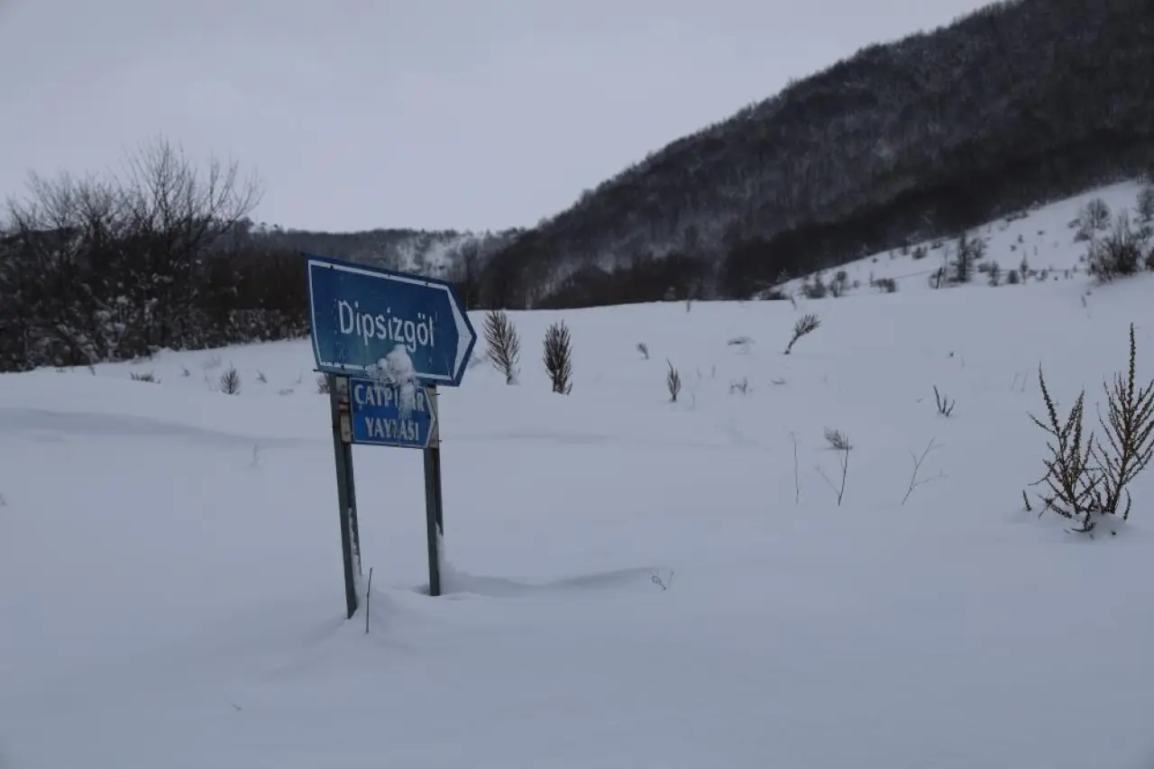Dipsizgöl’ün hemen yanı başında, yaklaşık 50 metre yükseklikten dökülen Dipsizgöl Şelalesi’nde ise manzara tam tersi bir hal aldı. Akarken donan suyun oluşturduğu devasa buz sarkıtları, bölgeyi bir buz müzesine çevirdi. Bazı sarkıtların boyu 5 metreye kadar ulaşırken, şelalenin o gürleyen sesi yerini derin bir sessizliğe bıraktı. Çevredeki ağaçların karla kaplı dallarıyla birleşen bu donmuş şelale manzarası, Karadeniz’in yaylalarını andıran görüntüsüyle dron kameralarına kartpostallık kareler verdi.