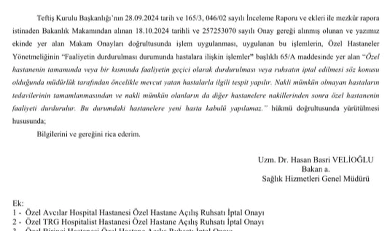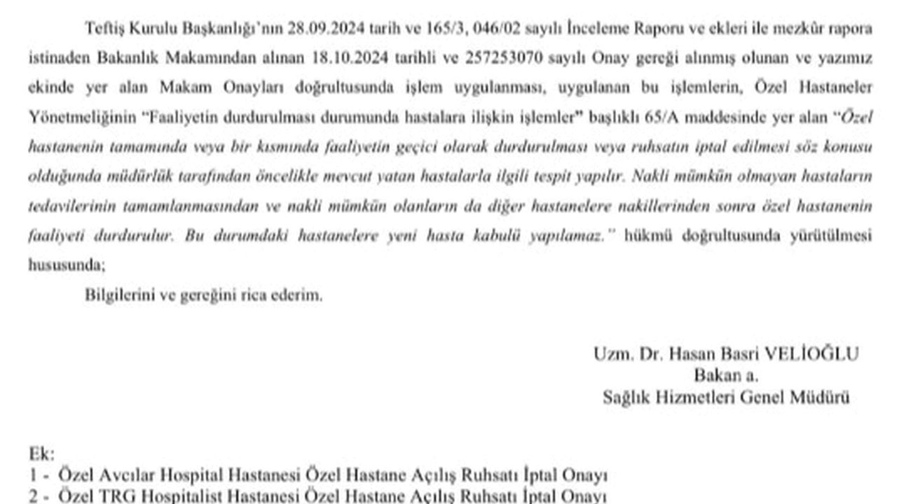 Yazıda, Teftiş Kurulu Başkanlığı"nın 28 Eylül 2024 tarihli inceleme raporu ve buna ek olarak sunulan belgeler doğrultusunda, Sağlık Bakanlığı"ndan alınan onaylar da göz önünde bulundurularak gerekli işlemlerin yapılması gerektiği ifade edildi. Özel Hastaneler Yönetmeliği"nin "Faaliyetin durdurulması durumunda hastalara ilişkin işlemler" başlıklı 65/A maddesine atıfta bulunarak, ruhsat iptalinin ve faaliyetin durdurulmasının, mevcut hastaların sağlık durumları dikkate alınarak gerçekleştirileceği belirtildi.