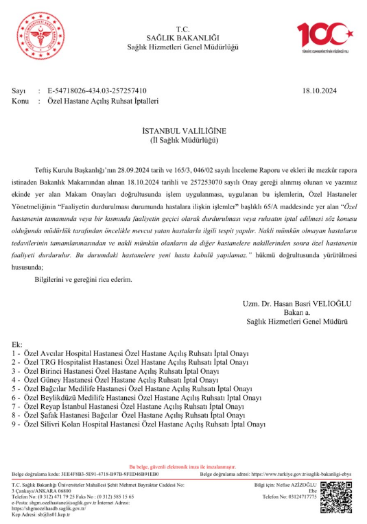 Bu kapsamda, Sağlık Hizmetleri Genel Müdürlüğü, İstanbul İl Sağlık Müdürlüğü"ne resmi bir yazı göndererek, yürütülen incelemelerin sonucunda 9 özel hastanenin ruhsatlarının iptal edilmesini talep etti.