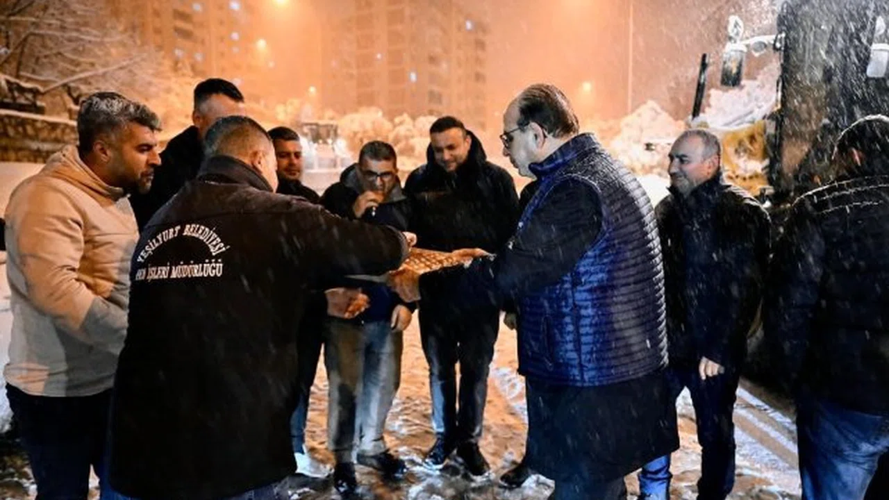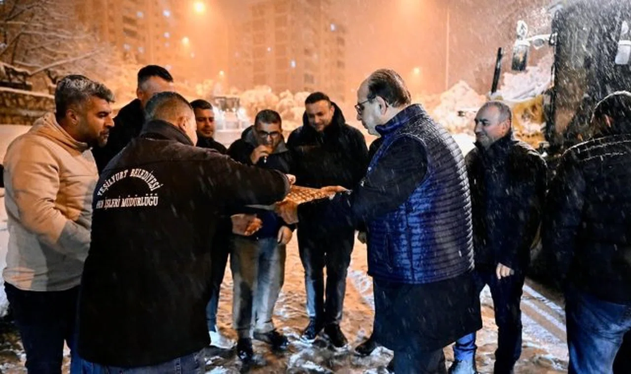Gece-gündüz demeden vatandaşların rahatı ve huzuru için çalışan belediye personellerine kolaylıklar dileyip tatlı ikramında bulunan Başkan Geçit, Yeşilyurt'un cadde ve sokaklarında her hangi bir olumsuzluk yaşanmaması için görevlendirilen ekiplerin 24 saat esasıyla çalışmalarını aralıksız sürdürdüğünü söyledi.