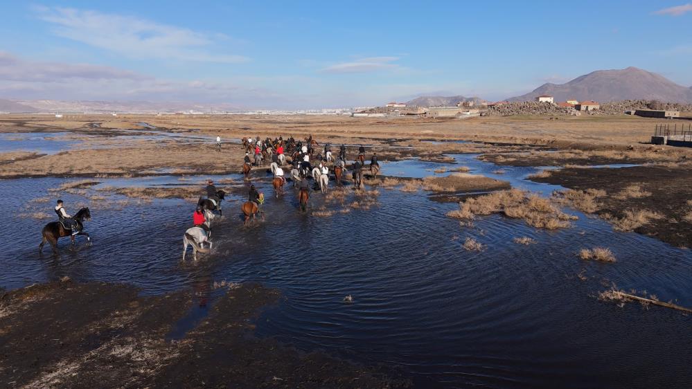 Kayseri'de 50 at binicisi, doğal güzellikleriyle dikkat çeken ve çok sayıda yılkı atının bulunduğu Hürmetçi'de atlı safari yaptı. Atlıların safarisi havadan görüntülendi.