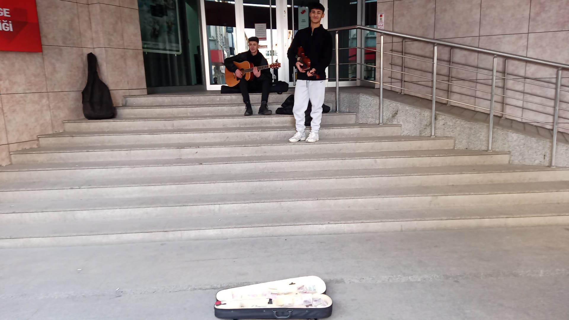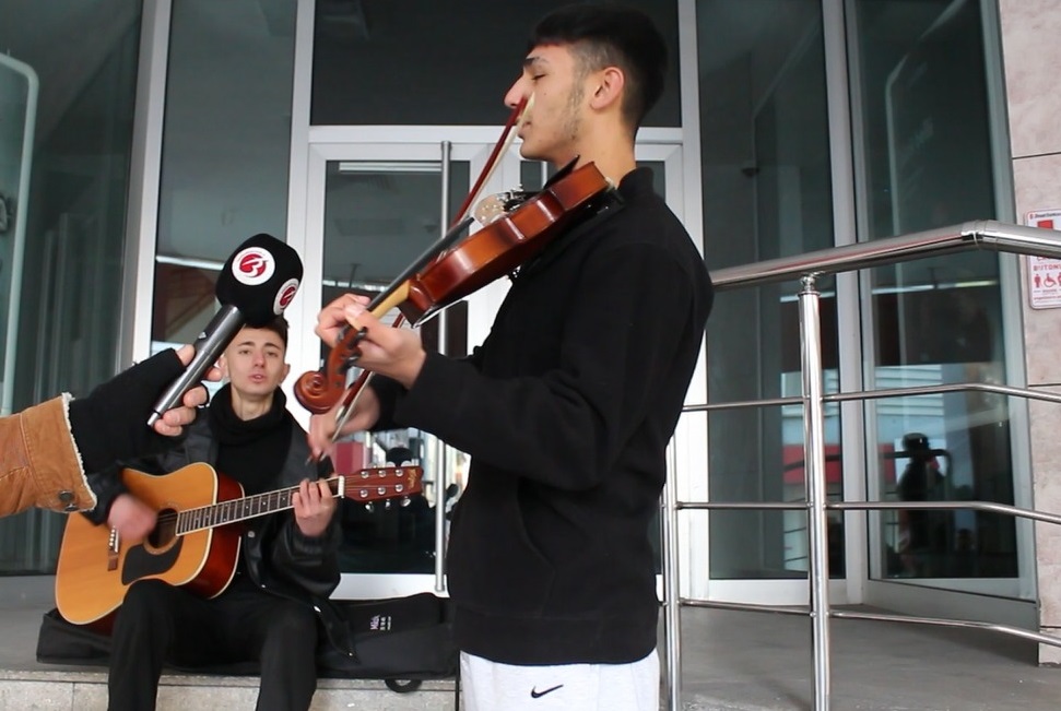 Caddede, gitarlarıyla ve sıcak sesleriyle duydukları ilgiyi görmekten mutluluk duyan ikili, hem dinleyicilere keyifli bir müzik deneyimi sunuyor hem de kendi eğitim masraflarına katkı sağlıyorlar.