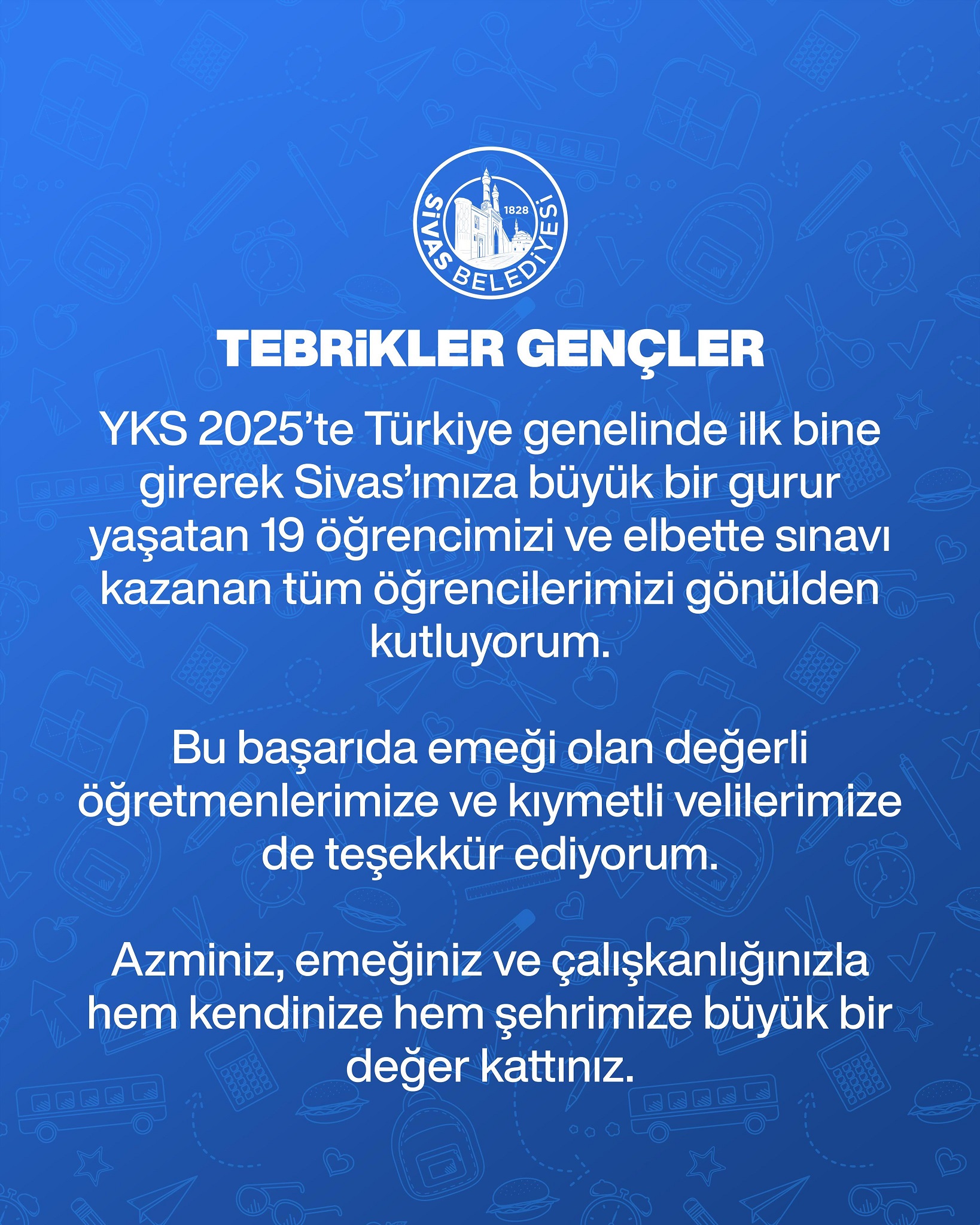 2025 Yükseköğretim Kurumları Sınavı (YKS) sonuçlarının açıklanmasıyla birlikte Sivas, tarihi bir gurur yaşadı. Türkiye'nin en başarılı öğrencileri arasına adını yazdıran 19 Sivaslı genç, ülke genelinde ilk binlik dilime girerek şehre büyük bir sevinç yaşattı. Sonuçların ilan edilmesinin hemen ardından Sivas Belediye Başkanı Dr. Adem Uzun, hem bu parlak başarıyı hem de sınava giren tüm gençleri kucaklayan anlamlı mesajlar yayınladı.