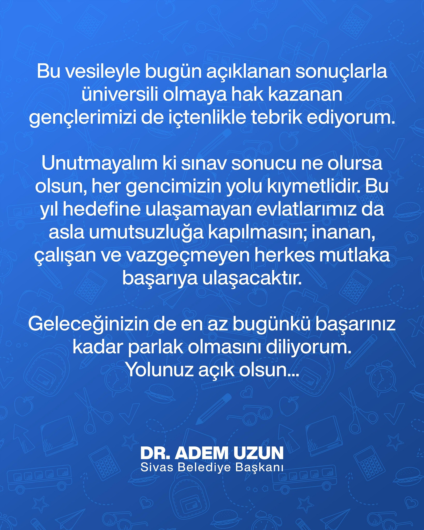Başkan Adem Uzun, başarının coşkusunu paylaşırken, hedefine bu yıl ulaşamayan öğrencileri de unutmadı. Kapsayıcı ve babacan bir üslupla yayınladığı ikinci mesajında, sınavın bir son değil, bir başlangıç olduğunu vurguladı. "Unutmayalım ki sınav sonucu ne olursa olsun, her gencimizin yolu kıymetlidir," diyen Başkan Uzun, şu ifadelerle gençlere moral verdi: "Bu yıl hedefine ulaşamayan evlatlarımız da asla umutsuzluğa kapılmasın; inanan, çalışan ve vazgeçmeyen herkes mutlaka başarıya ulaşacaktır."