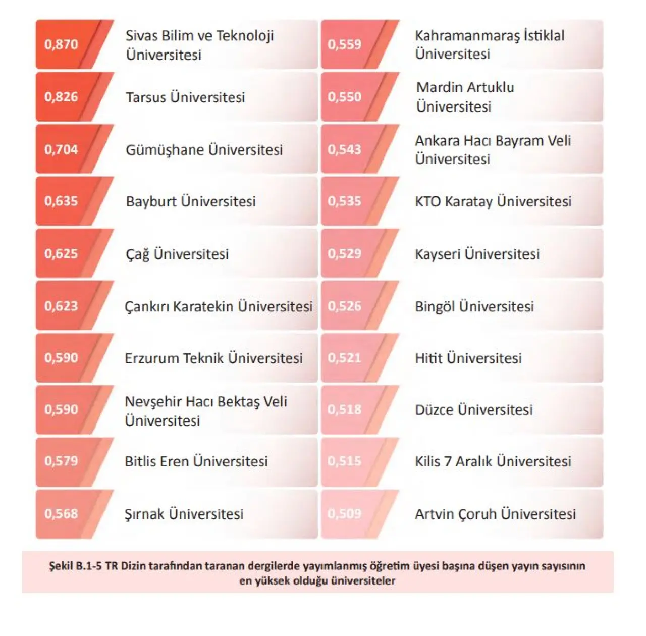 2025 raporunun en dikkat çekici verilerinden biri, öğretim üyesi başına düşen yayın sayısı oldu. Ulusal akademik üretim kapasitesini gösteren TR Dizin verilerine göre, Sivas Bilim ve Teknoloji Üniversitesi (0,87) oranla Türkiye genelinde ilk sırada yer alarak tarihi bir başarıya imza attı. SBTÜ’nün ardından Tarsus ve Gümüşhane Üniversiteleri gelse de, Sivas’ın bu alandaki liderliği şehrin akademik üretim kültürünün ne kadar güçlü olduğunu kanıtladı. Bu başarı, Sivas’ın artık sadece bir tarım veya sanayi şehri değil, aynı zamanda nitelikli bir bilim merkezi olduğunun en somut göstergesi olarak kayıtlara geçti.