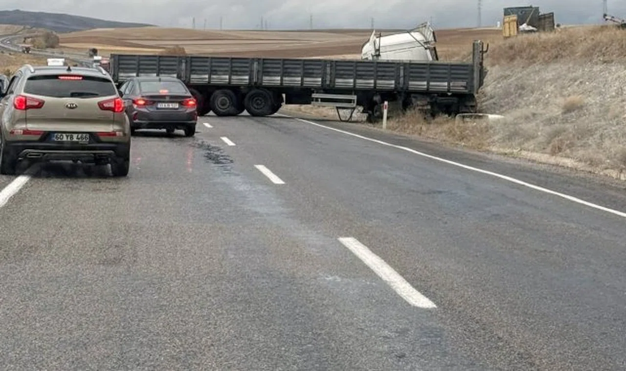 Yozgat'ın Sarıkaya ilçesinde yağışlı havanında etkisiyle yoldan çıkan tırın kasası yolu boydan boya kaplarken, trafik kısa süreliğine durdu.
