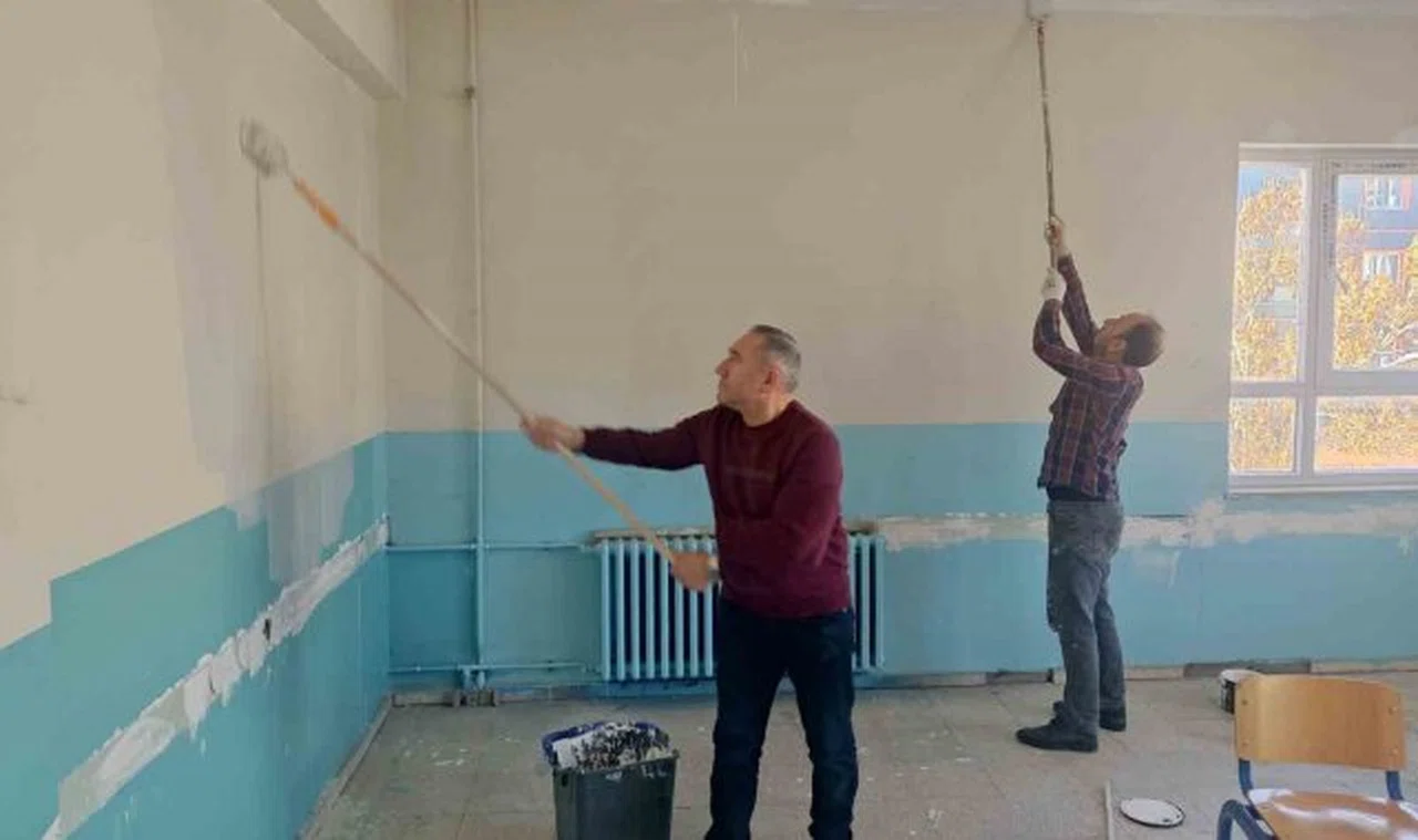 Aksoy, Şehit Adem Canpolat Ortaokulu mescidinin boyasını okul müdürü İsmail Karataş ile birlikte yaptı.