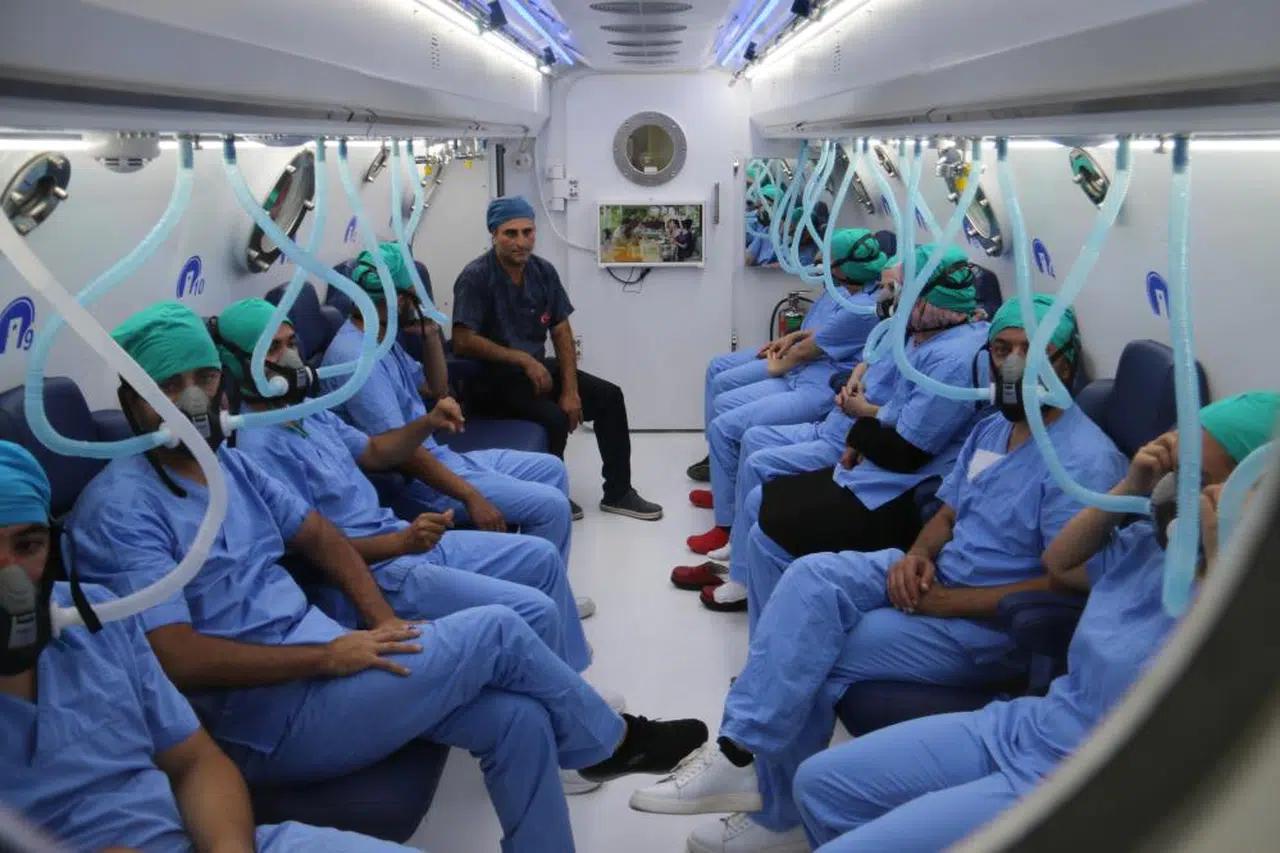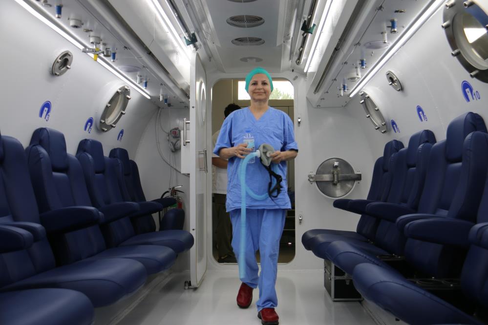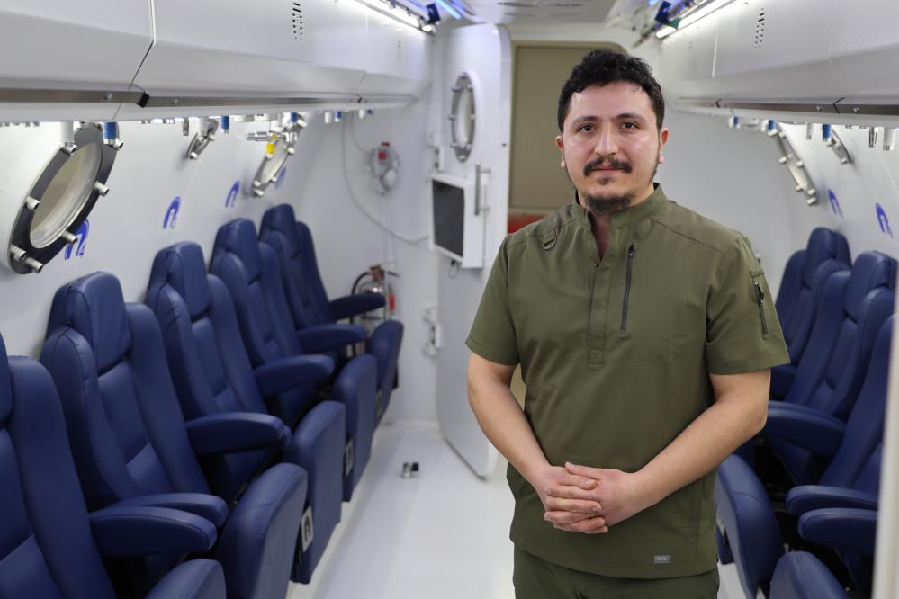 Tedavi ünitesi ile ilgili bilgiler veren Sualtı Hekimliği ve Hiperbarik Tıp Uzmanı Dr. Soner Uludağ, "Burası Hiperbarik oksijen tedavisini uyguladığımız ünite. Hiperbarik oksijen tedavisi, basınç odası diye tabir ettiğimiz kapalı alan içerisinde yüksek basınçla yüzde yüz oksijen tedavisi olarak özetleyebiliriz. Hastalarımız, burada tedavilerini oksijen maskesi veya benzeri aparatlarla oksijeni soluyarak almaktadır. Hiperbarik oksijen tedavisinin genel kullanım alanlarına değinecek olursak, özellikle halk arasında bilinen şeker hastalıkları ve damar tıkanıklığına bağlı iyileşmeyen yaraların tedavisinde sıklıkla kullandığımız bir yöntemdir.